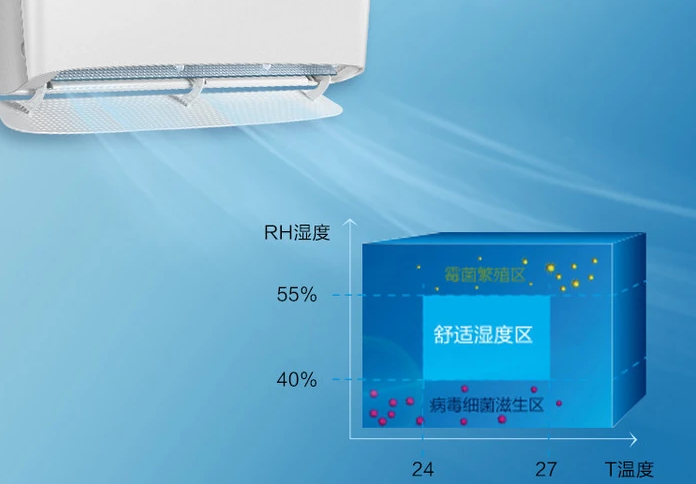 海尔新风空调支持柔湿变频,实现温度和湿度双调节控制,在人体最舒服的范围内,同时抑制病菌活性,实现柔湿抑菌,让室内清爽不干燥更加舒适。另外可以56℃除菌自洁,采用第五代自清洁技术,可极速提高蒸发器、风道、出风口温度到56℃以上,并持续30分钟,在空调内部形成一个高温除菌舱,除菌率高达99.9%。通过多方面的除菌净化空气,让你只吹干净风。