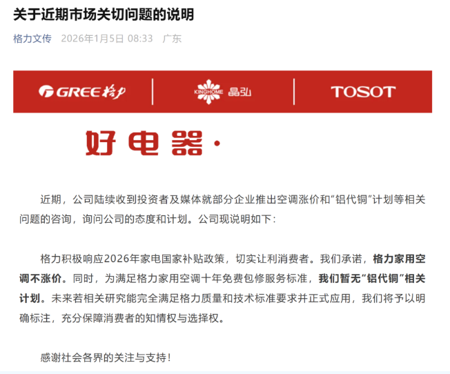 格力家用空调不涨价的核心逻辑很明确:杜绝补贴资金 “跑冒滴漏”,不让原材料涨价成本变相转嫁给财政与用户。格力电器以"铝代铜"的技术争议为镜,始终坚守全铜核心器件的制造准则。这个看似保守的选择背后,蕴含着对产品本质的深刻理解——空调作为家庭长期使用的耐用品,其耐用性、安全性与能效表现才是真正的核心竞争力。